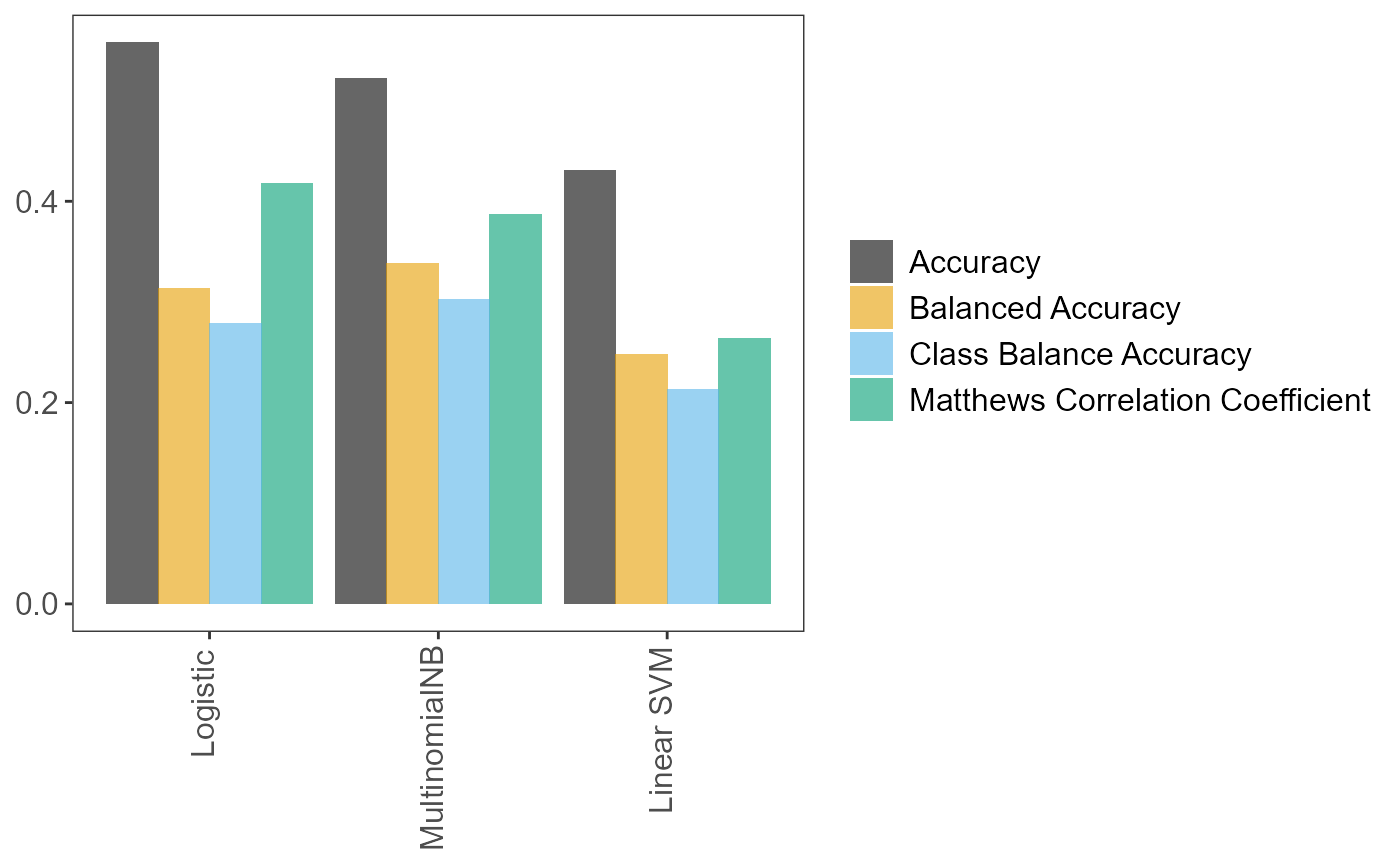 # Prepare training and test sets data_splits <- pxtextmineR::factory_data_load_and_split_r( filename = pxtextmineR::text_data, target = "label", predictor = "feedback", test_size = 0.90) # Make a small training set for a faster run in this example # Let's take a look at the returned list str(data_splits)#> List of 6 #> $ x_train :'data.frame': 1033 obs. of 1 variable: #> ..$ predictor: chr [1:1033] "Very helpful and friendly." "Prompt appointment - information delivered clearly video appointment but everything worked well. Tian was very kind. " "FIrst Class" "Be a bit quicker when they are discharging you." ... #> ..- attr(*, "pandas.index")=Int64Index([5503, 2371, 3214, 8067, 5880, 5011, 9713, 5085, 1416, 3565, #> ... #> 1879, 3833, 5913, 130, 7556, 1177, 1287, 2813, 8771, 1690], #> dtype='int64', length=1033) #> $ x_test :'data.frame': 9301 obs. of 1 variable: #> ..$ predictor: chr [1:9301] "Absolutely happy wIth everythIng, very nIce people." "More staff At times the ward felt understaffed and with such poorly children" "Always lIstened to regardIng any Issues." "Listen. \nStaff communication with each other was excellent, it gave me a much better experience this time. T"| __truncated__ ... #> ..- attr(*, "pandas.index")=Int64Index([ 2663, 8720, 2772, 1634, 7900, 1815, 2534, 1766, 10026, #> 7140, #> ... #> 1213, 5090, 1385, 5740, 4183, 7520, 2770, 2408, 5436, #> 1266], #> dtype='int64', length=9301) #> $ y_train : chr [1:1033(1d)] "Care received" "Access" "Care received" "Transition/coordination" ... #> ..- attr(*, "dimnames")=List of 1 #> .. ..$ : chr [1:1033] "5503" "2371" "3214" "8067" ... #> $ y_test : chr [1:9301(1d)] "Care received" "Staff" "Communication" "Communication" ... #> ..- attr(*, "dimnames")=List of 1 #> .. ..$ : chr [1:9301] "2663" "8720" "2772" "1634" ... #> $ index_training_data: int [1:1033] 5503 2371 3214 8067 5880 5011 9713 5085 1416 3565 ... #> $ index_test_data : int [1:9301] 2663 8720 2772 1634 7900 1815 2534 1766 10026 7140 ...# Fit the pipeline pipe <- pxtextmineR::factory_pipeline_r( x = data_splits$x_train, y = data_splits$y_train, tknz = "spacy", ordinal = FALSE, metric = "accuracy_score", cv = 2, n_iter = 10, n_jobs = 1, verbose = 3, learners = c("SGDClassifier", "MultinomialNB") ) # (SGDClassifier represents both logistic regression and linear SVM. This # depends on the value of the "loss" hyperparameter, which can be "log" or # "hinge". This is set internally in factory_pipeline_r). # Assess model performance pipe_performance <- pxtextmineR::factory_model_performance_r( pipe = pipe, x_train = data_splits$x_train, y_train = data_splits$y_train, x_test = data_splits$x_test, y_test = data_splits$y_test, metric = "accuracy_score") names(pipe_performance)#> [1] "pipe" "tuning_results" "pred" #> [4] "accuracy_per_class" "p_compare_models_bar"# Let's compare pipeline performance for different tunings with a range of # metrics averaging the cross-validation metrics for each fold. pipe_performance$ tuning_results %>% dplyr::select(learner, dplyr::contains("mean_test"))#> learner mean_test_Accuracy mean_test_Balanced Accuracy #> 2 Logistic 0.5575941 0.3137440 #> 0 Logistic 0.5324266 0.3695176 #> 6 MultinomialNB 0.5217639 0.3385196 #> 5 Logistic 0.5169227 0.3449101 #> 4 MultinomialNB 0.4375384 0.3138912 #> 3 Linear SVM 0.4307424 0.2475875 #> 1 Logistic 0.4288344 0.2762078 #> 7 Linear SVM 0.3988275 0.2486355 #> 8 MultinomialNB 0.3987862 0.2584215 #> 9 MultinomialNB 0.3678272 0.2691415 #> mean_test_Matthews Correlation Coefficient mean_test_Class Balance Accuracy #> 2 0.4173449 0.2784928 #> 0 0.4026087 0.3276369 #> 6 0.3868081 0.3025500 #> 5 0.3850773 0.3081798 #> 4 0.3069311 0.2523217 #> 3 0.2640922 0.2134373 #> 1 0.2682233 0.2329601 #> 7 0.2369170 0.2099112 #> 8 0.2538160 0.2117422 #> 9 0.2251304 0.1871887# A glance at the (hyper)parameters and their tuned values pipe_performance$ tuning_results %>% dplyr::select(learner, dplyr::contains("param_")) %>% str()#> 'data.frame': 10 obs. of 22 variables: #> $ learner : chr "Logistic" "Logistic" "MultinomialNB" "Logistic" ... #> $ param_sampling__kw_args : chr "{'up_balancing_counts': 800}" "{'up_balancing_counts': 300}" "{'up_balancing_counts': 800}" "{'up_balancing_counts': 800}" ... #> $ param_preprocessor__texttr__text__transformer__use_idf :List of 10 #> ..$ : logi FALSE #> ..$ : logi TRUE #> ..$ : logi TRUE #> ..$ : logi FALSE #> ..$ : logi FALSE #> ..$ : logi FALSE #> ..$ : logi FALSE #> ..$ : logi TRUE #> ..$ : logi TRUE #> ..$ : logi TRUE #> $ param_preprocessor__texttr__text__transformer__tokenizer : chr "<pxtextmining.helpers.tokenization.LemmaTokenizer object at 0x000000006F3FA730>" "<pxtextmining.helpers.tokenization.LemmaTokenizer object at 0x000000006F3FA730>" "<pxtextmining.helpers.tokenization.LemmaTokenizer object at 0x000000006F3FAC10>" "<pxtextmining.helpers.tokenization.LemmaTokenizer object at 0x000000006F3FA730>" ... #> $ param_preprocessor__texttr__text__transformer__preprocessor: chr "<function text_preprocessor at 0x00000000665D93A0>" "<function text_preprocessor at 0x00000000665D93A0>" "<function text_preprocessor at 0x00000000665D93A0>" "<function text_preprocessor at 0x00000000665D93A0>" ... #> $ param_preprocessor__texttr__text__transformer__norm :List of 10 #> ..$ : NULL #> ..$ : chr "l2" #> ..$ : chr "l2" #> ..$ : chr "l2" #> ..$ : NULL #> ..$ : chr "l2" #> ..$ : chr "l2" #> ..$ : chr "l2" #> ..$ : chr "l2" #> ..$ : chr "l2" #> $ param_preprocessor__texttr__text__transformer__ngram_range : chr "(1, 3)" "(1, 3)" "(1, 3)" "(1, 3)" ... #> $ param_preprocessor__texttr__text__transformer__min_df :List of 10 #> ..$ : int 1 #> ..$ : int 1 #> ..$ : int 1 #> ..$ : int 1 #> ..$ : int 1 #> ..$ : int 1 #> ..$ : int 3 #> ..$ : int 3 #> ..$ : int 3 #> ..$ : int 3 #> $ param_preprocessor__texttr__text__transformer__max_df :List of 10 #> ..$ : num 0.7 #> ..$ : num 0.7 #> ..$ : num 0.95 #> ..$ : num 0.95 #> ..$ : num 0.95 #> ..$ : num 0.7 #> ..$ : num 0.7 #> ..$ : num 0.95 #> ..$ : num 0.7 #> ..$ : num 0